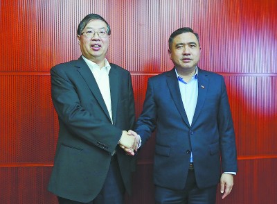 图为庄尚标与马来西亚国会议员、交通部部长陆兆福亲切握手。李祯林 摄 |