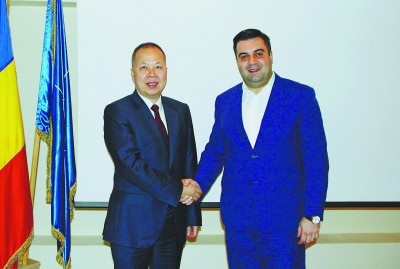 图为陈奋健与罗马尼亚交通部部长阿列克桑德鲁亲切握手。沈 欣 摄 |