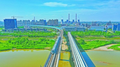 日前,由中铁十七局承建的陕西首条城际铁路——西安北客站至机场城际铁路进入试运行阶段。该项目建设中,建设者完成了国内轨道交通联长最长、体系转换最多的渭河特大桥主河槽连续梁施工;盾构施工成功下穿西安咸阳国际机场,创下了日掘进49.5米、成环33环的全国同类地铁盾构施工日掘进最高纪录。图为试运行城际列车行驶在渭河特大桥上。牛奋香 摄