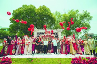 近日,中铁十九局六公司“缘来铁建最江南”集体婚礼在太湖之滨无锡举行,来自该公司的13对新人一同步入婚姻殿堂。据悉,这是该公司工会自2013年以来精心打造的第3次集体婚礼,已累计为32对新人搭建起通向幸福的平台。图为新人们抛起绣球祈愿幸福。李宏福 摄