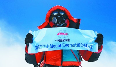 8844.43米,珠穆朗玛峰之巅。凛冽的寒风击打着护具下的脸庞,穿着厚厚的登山服,他坐在雪地中定了定神,双手用力拉着印有中国铁建和中土集团标识的旗帜,录下短视频:“祝贺公司蒸蒸日上!”