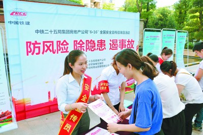 6月16日,在全国安全生产宣传咨询日当天,中铁二十五局房地产公司在衡阳金色蓝庭小区开展“防风险 除隐患 遏事故”主题安全宣传活动。图为该公司员工向小区居民发放安全手册。