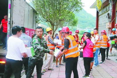 6月18日13时,中铁十一局仁沐新公路项目救援突击队队员在四川长宁地震灾区协助当地政府搬运救援物资。连兴明 摄