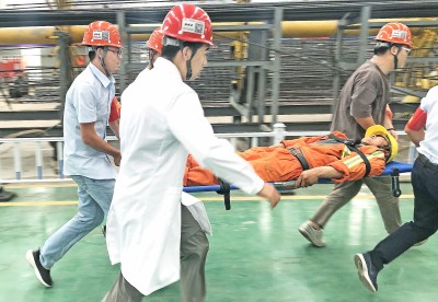 6月19日,中铁十六局三公司苏州南湖路项目开展了触电事故应急救援演练,并将培训心肺复苏应急救援知识的课堂搬到了施工现场,为职工送上了一场“安全盛宴”。图为救援演练现场。杨晨煜 摄