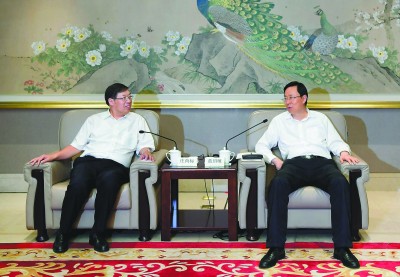 图为庄尚标与南京市委副书记、市长蓝绍敏亲切交谈。李美华 摄 |