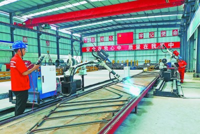 近日,中铁十四局三公司苏锡常项目部使用的全自动焊接机器人吸引相邻标段前来观摩。该机器人节省了大量人工,工作效率提高2.5倍,焊接质量稳定可靠,同时避免了近距离焊接电弧对工人的伤害。图为全自动焊接机器人在进行焊接作业。尹 辉 摄