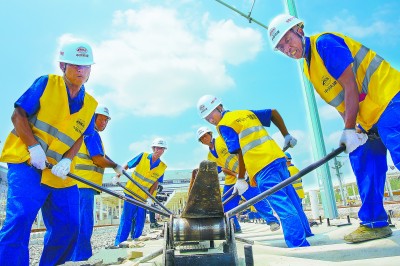 7月24日,由中铁十一局等单位建设的我国华东地区第二条快速客运通道——商合杭高铁合肥至商丘段铺轨完成。该高铁全长约794.55公里,设计时速350公里,预计2020年全线开通运营。届时,杭州至商丘将由11个小时缩短至4个小时左右。图为作业人员正在铺设最后一组500米长轨。 彭 特 摄