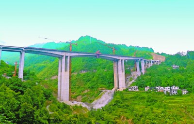 日前,由中铁二十局四公司承建的石黔高速公路首座连续刚构桥——连湖大桥主跨合龙。石黔高速公路全长83公里,建成后,黔江、石柱两地车程将由目前的3小时缩短至1小时。图为合龙后的石黔高速公路连湖大桥。