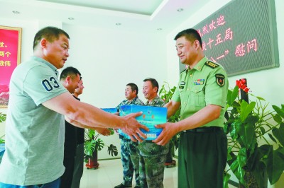 为庆祝中国人民解放军建军九十二周年,7月31日,中铁十五局五公司慰问组前往天津市红桥区人民武装部开展拥军慰问活动,向人民子弟兵致以节日的问候,共话军民鱼水情。图为该公司慰问组成员向武装部赠送慰问品。王 新 摄