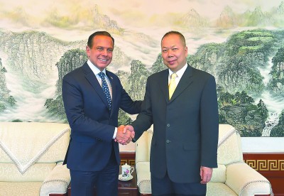 图为陈奋健与若昂·多利亚亲切握手。赵渊青 摄 |
