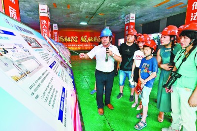 7月30日,中铁十一局城轨公司联合长江日报集团开展“致敬高温下的劳动者”系列活动。作为活动首站,武汉地铁建设二路站工地迎来热心市民“探秘团”,来自武汉市各行业30余名慰问者深入地铁施工现场,了解盾构施工情况。图为项目党工委书记为市民介绍地铁建设过程。张 玺 摄