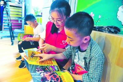 8月3日,中铁二十五局五公司志愿者来到青岛市某自闭症儿童康复学校开展慰问活动,为孩子们带去图书、益智玩具和精彩的文艺节目。图为志愿者陪孩子进行趣味阅读。孙兆伟 摄
