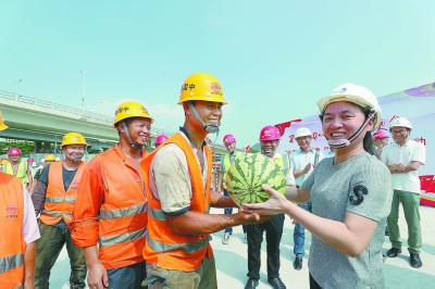 连日来,持续高温炙烤着鹏城大地。中国铁建人助力地方经济建设的忘我精神也感动着特区人。8月7日下午,深圳市南山区、前海控股公司等单位为在高温下工作的中铁建南方公司员工送来防暑降温用品,感谢中国铁建人为特区建设做出的贡献。图为前海控股副总裁张小妹(右一)给工人送上西瓜。