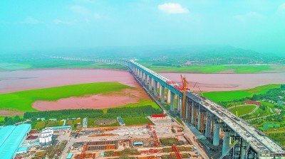 8月9日,由中国铁建大桥局四公司施工的蒙华铁路三门峡黄河公铁两用大桥南引桥公路连续梁右幅浇筑完成,标志着大桥铁路梁、公路梁全部贯通。这意味着,大桥建设将进入全力确保蒙华铁路10月1日按期通车的收尾冲刺阶段。图为正在建设中的蒙华铁路三门峡黄河公铁两用大桥。于小芳 摄