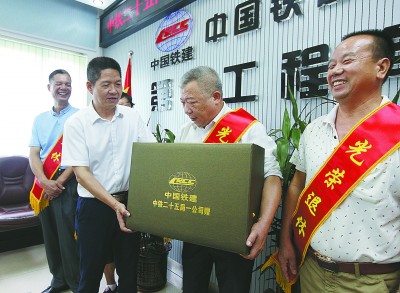 佩戴“光荣退休”绶带、宣读感谢信、赠送纪念品……近日,中铁二十五局一公司通过一场庄重而暖心的退休仪式,为8名退休职工送上感谢和祝福,让他们感受到企业关怀。图为该公司向退休职工赠送纪念品。黄诗伟 摄