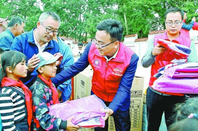 秋季开学前夕,中铁二十局市政公司志愿者向兰州市永登县武胜驿镇聂家湾小学学生发放校服和学习用品。为助力脱贫攻坚,该公司持续支持贫困山区教育事业,近年来共为甘肃山区儿童捐赠10万余元的助学物资。 闫彦龙摄