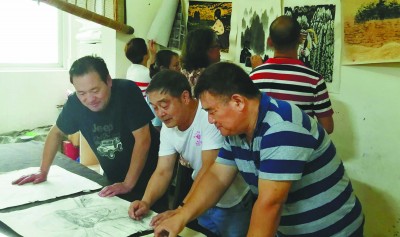 中铁二十局第十八届大路画展创作组版画骨干画家双道俊、冯毅、张斌会等正在研讨新创作的“一带一路”作品草图。 李雪梦 摄