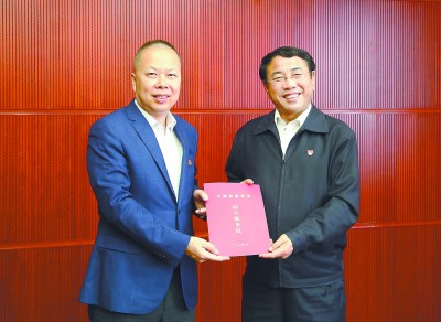 图为陈奋健代表中国铁建接受北京市海淀区委书记于军赠送的“综合服务包”。肖永顺 摄 |