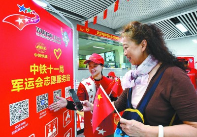 10月18日,第七届世界军人运动会在湖北武汉开幕。中铁十一局城轨公司“祁建光志愿服务队”的26名志愿者,在赛场周边地铁站,为观赛游客免费提供购票咨询、饮用热水、手机充电、应急救助等服务。图为一名志愿者引导游客扫描观赛指南二维码。张 玺 摄