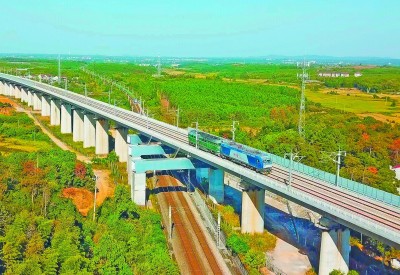 10月20日,由中铁十一局四公司参建的江西南昌至赣州高铁正式进入联调联试阶段,预计今年年底通车,井冈山革命老区、赣南等原中央苏区将迈入高铁时代,江西将实现市市通动车。昌赣高铁全长约416公里,设计时速350公里,是京港高铁的重要组成部分。图为联调联试车辆在昌赣高铁游坊特大桥上行驶。肖 帆 摄
