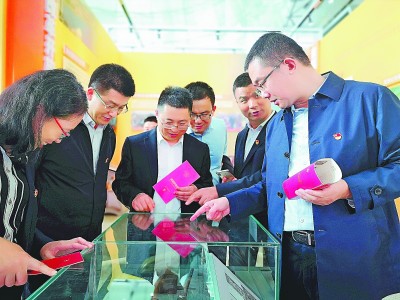 近日,中铁二十局四公司党委组织机关全体党员参观“庆祝新中国成立70周年——青岛成就展”,通过浏览历史照片、文物史料等,坚定党员守初心、担使命的信心和决心。图为党员干部参观展柜内陈列的历史物件。刘斌斌 摄