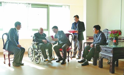 图为赵佃龙(左三)向陆大同(左二)转交中国铁建主管领导给他的生日贺信。 刘 军 摄 |
