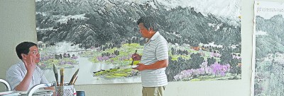 王秉良与李建设在画室探讨山水画创作。 王沂光 摄 |