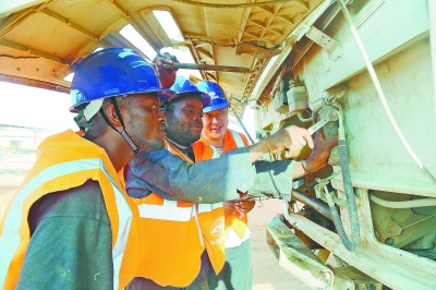 在安哥拉二期大市政项目建设中,为确保工程如期履约,中铁十四局通过开展技术革新、提高机械设备能效、大量聘用属地工人等措施,既加快了工程进度,又节约了施工成本,为解决当地就业、加快经济发展作出了积极贡献,赢得了当地居民和政府的好评。图为当地时间10月28日,安籍员工在中方技术人员指导下检修施工车辆。周存泉 摄