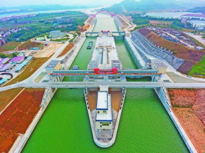 日前,由中国铁建港航局设计院设计的广东省规模最大双线船闸北江飞来峡枢纽二、三线船闸工程完成交工验收。该船闸工程建成运行后,将大大提升北江航道运力,为实现珠江、北江航运绿色发展及打造黄金水道远景目标提供重要支撑。图为已完工的北江飞来峡枢纽二、三线船闸工程。覃益官 摄