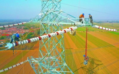 11月11日,经过168小时带电运行,由中铁十四局电气化公司负责施工的山东省高东高速公路首条双回路500千伏超高压线路——柴韶线、聊韶II线运行高效平稳,为下游用户用电提供了保障。图为施工人员正在进行电力迁改作业。范成涛 摄