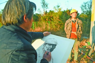 在建设工地,20余位大路画家刚下车,便迫不及待地拿起速写本唰唰地画起来,京张高铁的雄姿使他们赞叹不已;在座谈会场,大路画家与京张高铁建设者倾心交谈,共话新时代新作为新气象;在笔会现场,《一马当先》《百花争艳》等一幅幅传神画作使建设者们大开眼界;在员工身边,王沂光、董吉祥、张衍海、蔡频春、李建设、李文龙、于行江7位大路画家用国画、油画、素描和版画等艺术形式为京张高铁建设者造像,并将创作作品赠送给一线职工,饱含了大路画家对京张高铁建设者的敬仰和钦佩之情。