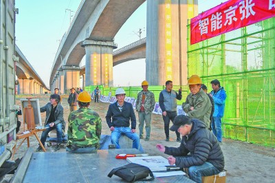 在工地书画笔会现场,大路画家与京张高铁建设者互相交流,切磋书画技艺。