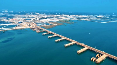 在广西北海市跨海第一桥西村港跨海大桥施工中,中铁二十局三公司秉持绿色施工理念,采用反循环钻机将沉渣和泥浆分离,并及时将施工垃圾分类收集后运走,减少桩基施工对海洋环境的污染。图为正在运输垃圾的车辆驶过西村港跨海大桥。陈福得 摄