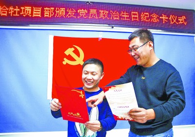 11月14日,中铁二十三局二公司哈牡电气化平改立项目党支部为该支部在11月入党的党员过“政治生日”,重温入党誓词,同时为党员颁发“政治生日纪念卡”,引导大家进一步强化党员身份意识、宗旨意识、责任意识,切实发挥党员先锋模范作用。图为项目党支部为党员颁发“政治生日纪念卡”。杨景霜 摄