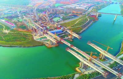 近日,由中铁二十五局承建的渝怀铁路增建二线全线控制性工程——舞水湾滩特大桥3号桥顺利合龙。该桥所属的3座桥为跨度168米的连续刚构桥,需在相距不足100米的范围内同时施工,并排跨越连续转弯超过180度的急弯河道和多处市政道路,属国内首次。图为舞水湾滩特大桥3号桥完成合龙。张 晶 摄