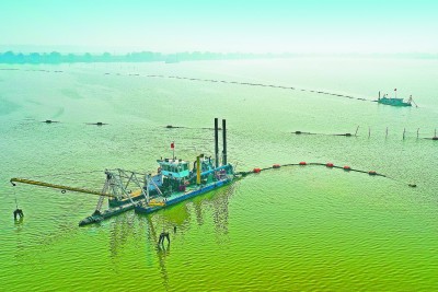 宿鸭湖清淤扩容工程是国家“十三五”规划确定的大型水库清淤扩容试点项目、河南省“四水同治”战略十大重点水利工程之一。中铁二十局五公司担负该湖的清淤扩容施工,竣工后,宿鸭湖将呈现“百里大坝锁洪水,万只野鸭戏游鱼”的美好景象。图为近日绞吸式挖泥船在进行清淤作业。唐相彦 摄