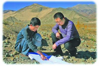 刘争平(右)带领工作室的青年工程师在青藏高原开展现场调查。丁 洋 摄 |