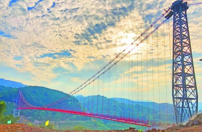 11月25日,由中铁十八局建安公司承建的国内跨度和荷载最大的管道悬索桥——重庆南川水江至涪陵白涛天然气管道乌江悬索桥具备通气投产条件。该桥是国内首个大型页岩气田——涪陵页岩气田开发配套的重点工程,横跨乌江,全长467.8米,主跨长355米,总荷载超过1008吨,位居国内同类管道悬索桥之首。图为通过验收的国内跨度和荷载最大的管道悬索桥。伍 振 摄