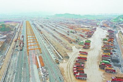 中铁二十局渝怀铁路增建二线7标段(怀化西编组站)项目是连接沪昆、焦柳、渝怀等6大铁路干线的中枢编组站。自2月份全面复工以来,中铁二十局组织1600多名施工人员、500多台施工机械全力推进项目建设,日前已开始铺轨。图为渝怀铁路增建二线7标段施工现场。 程 凯 摄