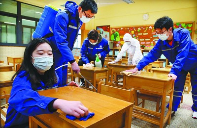 日前,在南京市各学校即将开学之际,中铁十四局南京长江五桥项目党支部组织党员、团员带着消杀工具,来到南京建邺实验小学,对学生教室、食堂等公共区域进行消杀,并向学校捐赠口罩、消毒液,为学生们顺利复课提供保障。王 艳 摄