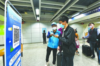 从4月8日零时起,武汉解除离汉离鄂通道管控,各地人员返回以及大批武汉滞留人员外出,给武汉地铁运输带来极大压力。日前,中铁十一局城轨公司组织青年志愿者,来到武昌火车站、地铁站帮助工作人员引导乘客进行体温测量和健康扫码。图为志愿者在地铁站帮助乘客进行健康扫码。黄诗尧 摄