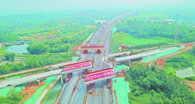 中铁十二局承建的开阳高速公路扩能改造2标段2号桥,重达570吨,是全线唯一一座曲线斜角桥,也是广东省高速公路扩改建设工程中最大的拆移、架设斜角天桥工程。日前,他们采用“千吨级桥梁上部结构拆建多功能智能一体机”,在同一时间段内完成了旧桥拆移、新桥架设任务,这在广东省公路建设中尚属首次。图为拆移、架梁现场。武 羽 摄
