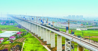 4月20日,通沪铁路赵甸至黄渡段开始联调联试。通沪铁路正线全长137.5公里,设计时速200公里,是国家中长期铁路网规划“八纵八横”高铁网中沿海通道的重要组成部分。开通运营后,铁路沿线多个城市将结束不通火车的历史,并被全部纳入上海市一小时“生活圈”,对推动长江三角洲区域一体化发展等具有重要意义。中铁十四局、中铁十九局参与该铁路建设。图为检测列车通过中铁十四局承建的长江大桥北引桥。李 宁 摄
