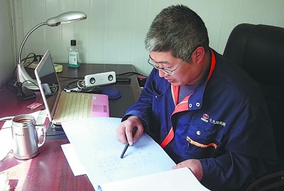 图为深夜,李绍杰伏案制订施工方案。房思文 摄 |