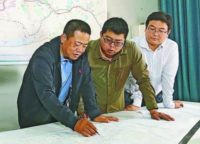 图为净文常(左)在西延高铁现场指导方案设计。靳 彤 摄 |