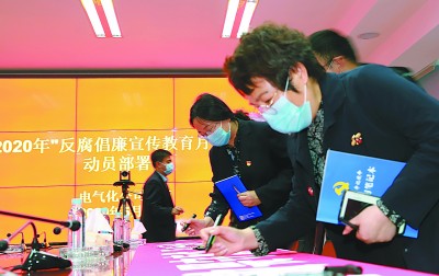 为扎实开展好“反腐倡廉宣传教育月”活动,中铁十四局电气化公司纪委组织各级党员领导干部,集中学习《管理追责实施办法》,着力构建“大监督”工作格局。图为5月12日,该公司机关人员在廉洁从业集体承诺条幅上签名。范成涛 摄
