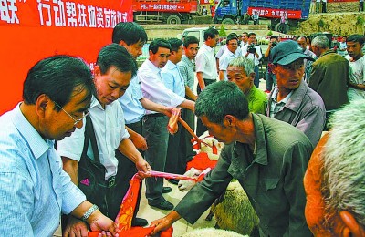 图为2012年7月7日,中铁二十一局干部职工和永靖县有关领导,将25只小尾寒羊基础“母羊”,送到精准帮扶的甘肃永靖县坪沟乡罗山村建档立卡贫困户手中。张兰忠 摄 |