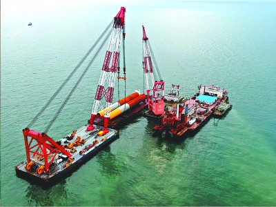 8月8日凌晨3时43分,随着打桩锤传出最后一声浑重的敲击声,由中国铁建港航局承建的启东H3号海上风电场项目首根钢管桩沉桩顺利完成,项目正式进入实质性施工阶段。该项目是中国铁建在黄海海域首个海上风电项目,也是目前在建海上风电项目中风机数量最多的项目。图为施工船舶正在进行沉桩作业。刘翊洲 摄