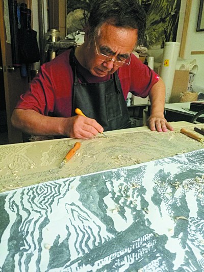 张衍海在刻制版画。 董吉祥 摄 |