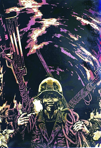 张衍海的版画作品散发着浓郁的生活气息,充满着创新的艺术智慧。在他的画中你可以尽情领略《走在疾驰前面》建设者的豪迈,《云舒风爽》《顶天立地》汉子的身影,还有那《笔绘昆仑》与《草原恋歌》的天籁和鸣,欣赏他的画作仿佛就是在审视他几十年行走于中国铁建大路生活的沉甸甸的阅历。他的画正是他亲身经历过,并用心感受过的现实,是对中国铁建人的真实写照,又是对劳动者的深情歌颂。他的画也正像他的诗一样,铿锵中和着委婉,直抒他久久难以割舍的铁色情怀。